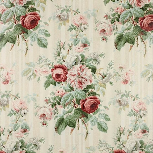 Jubilee Rose by Colefax & Fowler is a Stunning 100% Cotton Chintz floral fabric with a delicate stripe in the background
